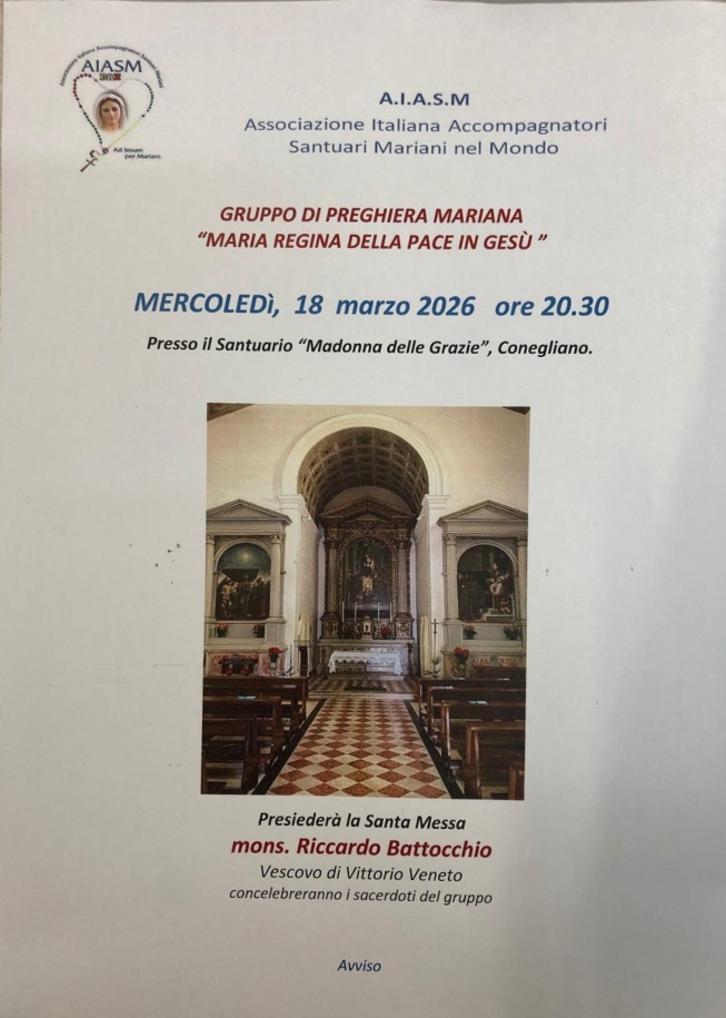 In occasione dell'incontro di preghiera del 18 marzo, che ricorre ogni mercoledì, avremo l'onore della visita del Monsignore Riccardo Battocchio Vescovo della Diocesi di Vittorio Veneto, il quale presiederà la S. Messa. La celebrazione si terrà nella chiesetta della Madonna delle Grazie a Conegliano, ore 20.30.